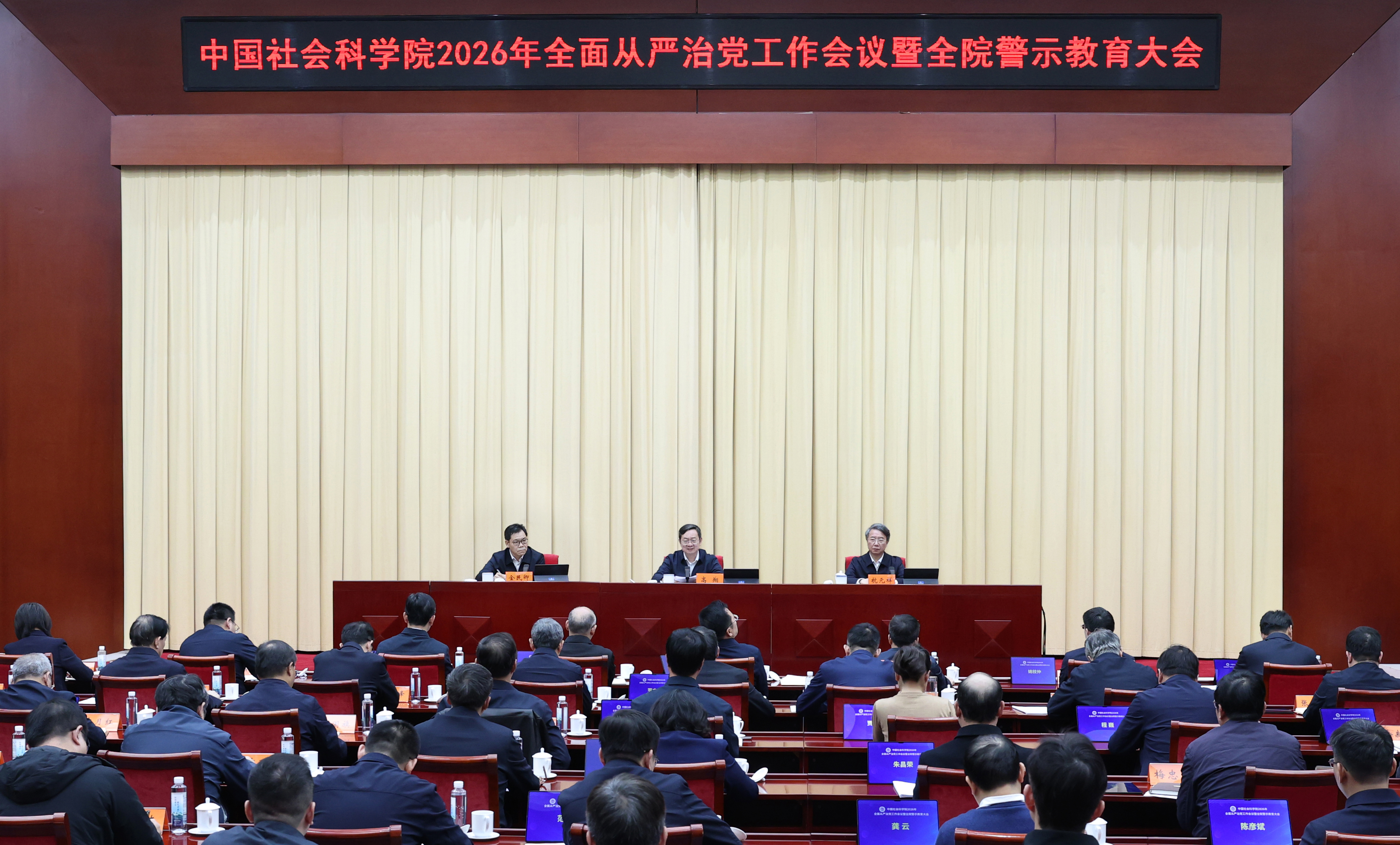 中国社会科学网讯(记者高莹)2月5日,中国社会科学院召开2026年全面从严治党工作会议暨全院警示教育大会,深入学习贯彻二十届中央纪委五次全会精神、2026年中央和国家机关党的工作暨纪检工作会议精神,部署2026年全面从严治党工作。院长、党组书记高翔出席会议并讲话。中央纪委国家监委驻院纪检监察组组长、院党组成员杭元祥通报有关情况并提出工作要求。院党组成员、当代中国研究所所长金民卿主持会议。